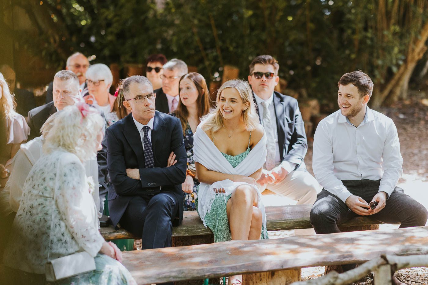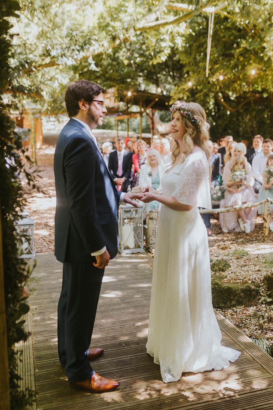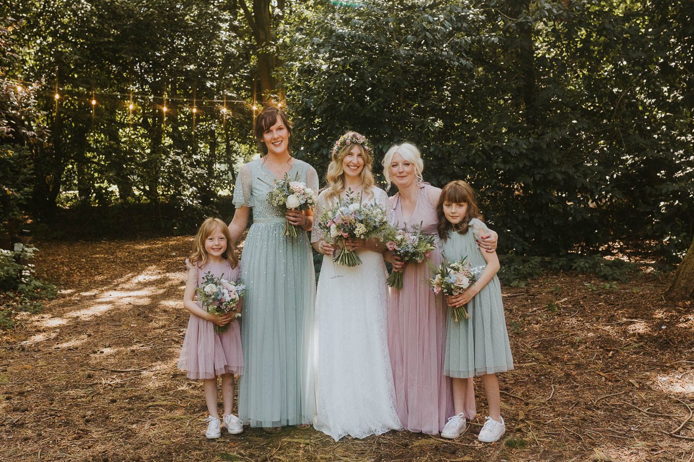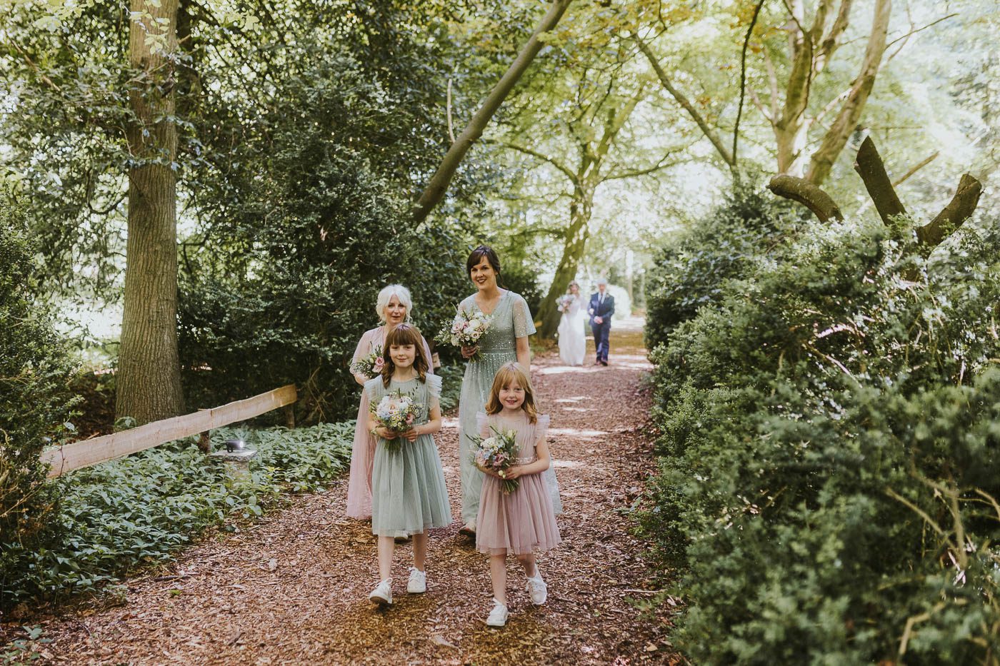 I spent the next hour or so capturing Michelle having her hair and make up done by Natalie, and chatting with her bridesmaids and lovely flower girls who were such sweethearts. Her mum joined us when she was dressed and set off crying pretty much as she walked in and saw Michelle having her flower crown fitted! Then it was time to tidy up and get Michelle into her dress. We brought her dad in to see her all ready to go and then I made my way over to the woodland wedding area where the ceremony and reception were taking place. I hadn’t been to Hazlewood in nearly 3 years so this was my first time seeing their new woodland venue, and it’s gorgeous!