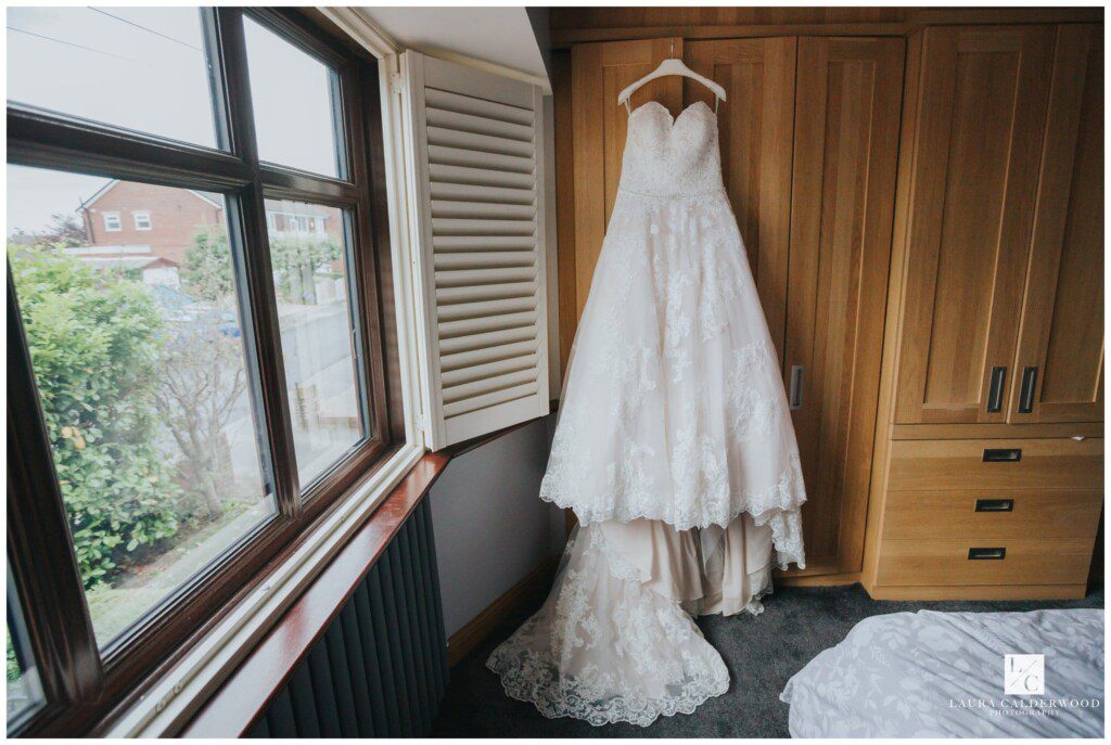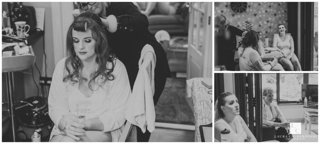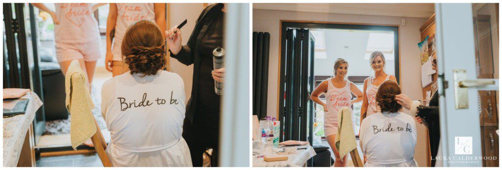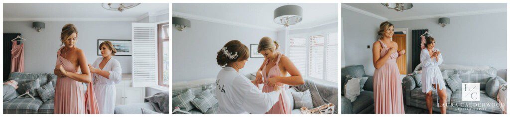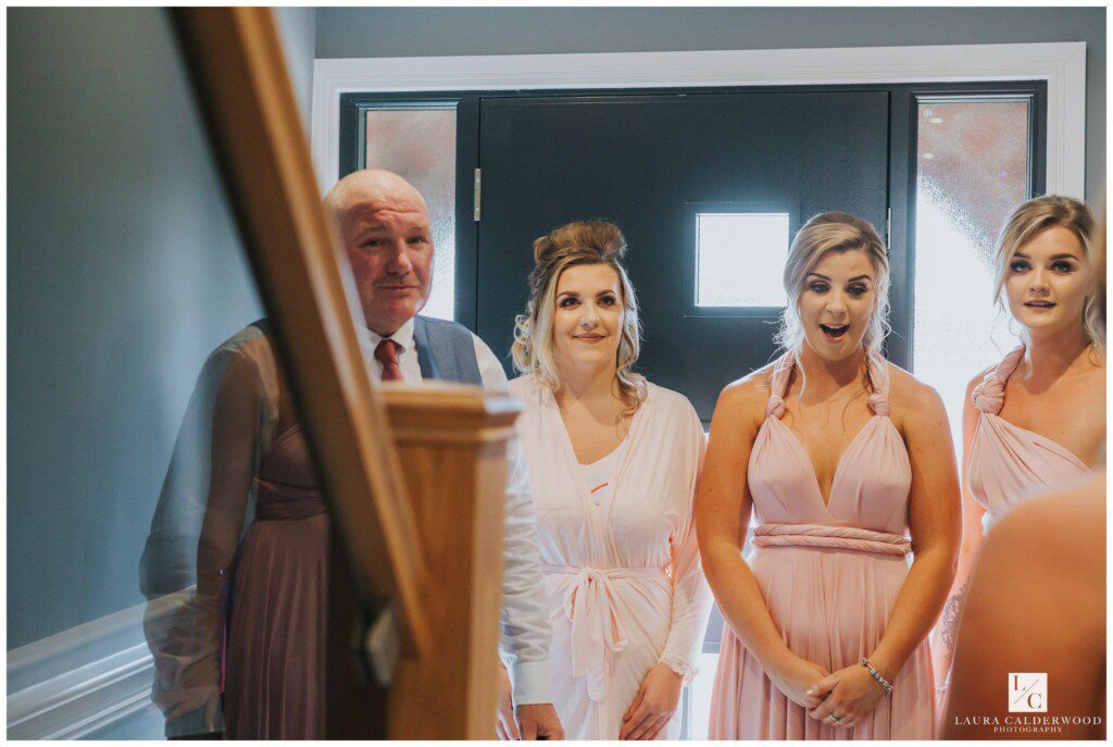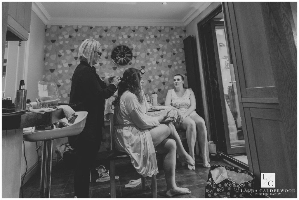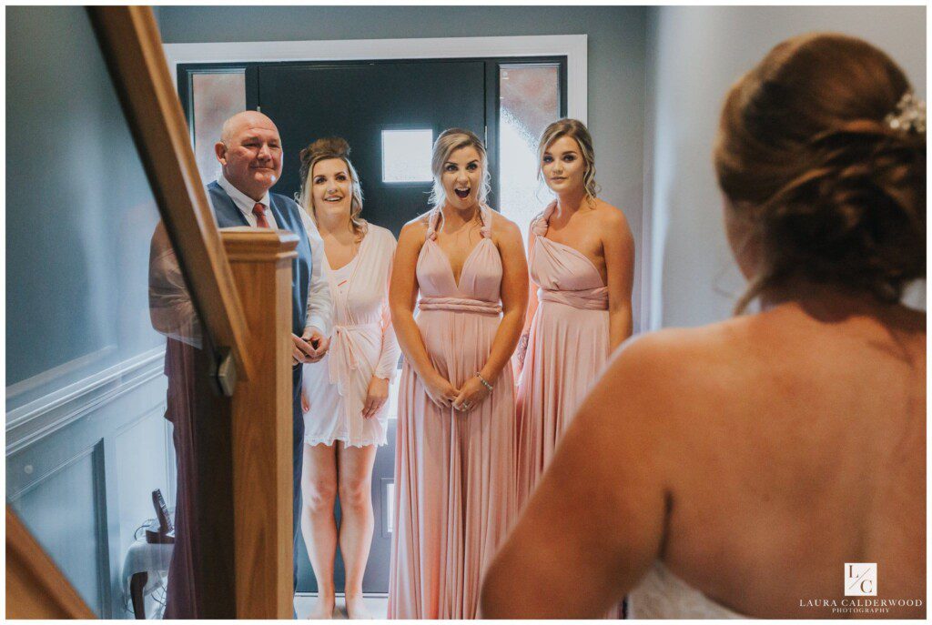 We were joined by fab videographer Bradley Green who was so lovely to work with – highly recommend him! Once hair and make up were done it was time to get Amy dressed. We opted for the living room since it was so light and there was plenty of space for Amy in her huge dress! When the many tiny buttons were finally dine up (I really should keep a crochet hook in my bag for that!) we coordinated my’s dad and bridesmaids in the hallway ready to see the finished product. They were all suitably impressed!