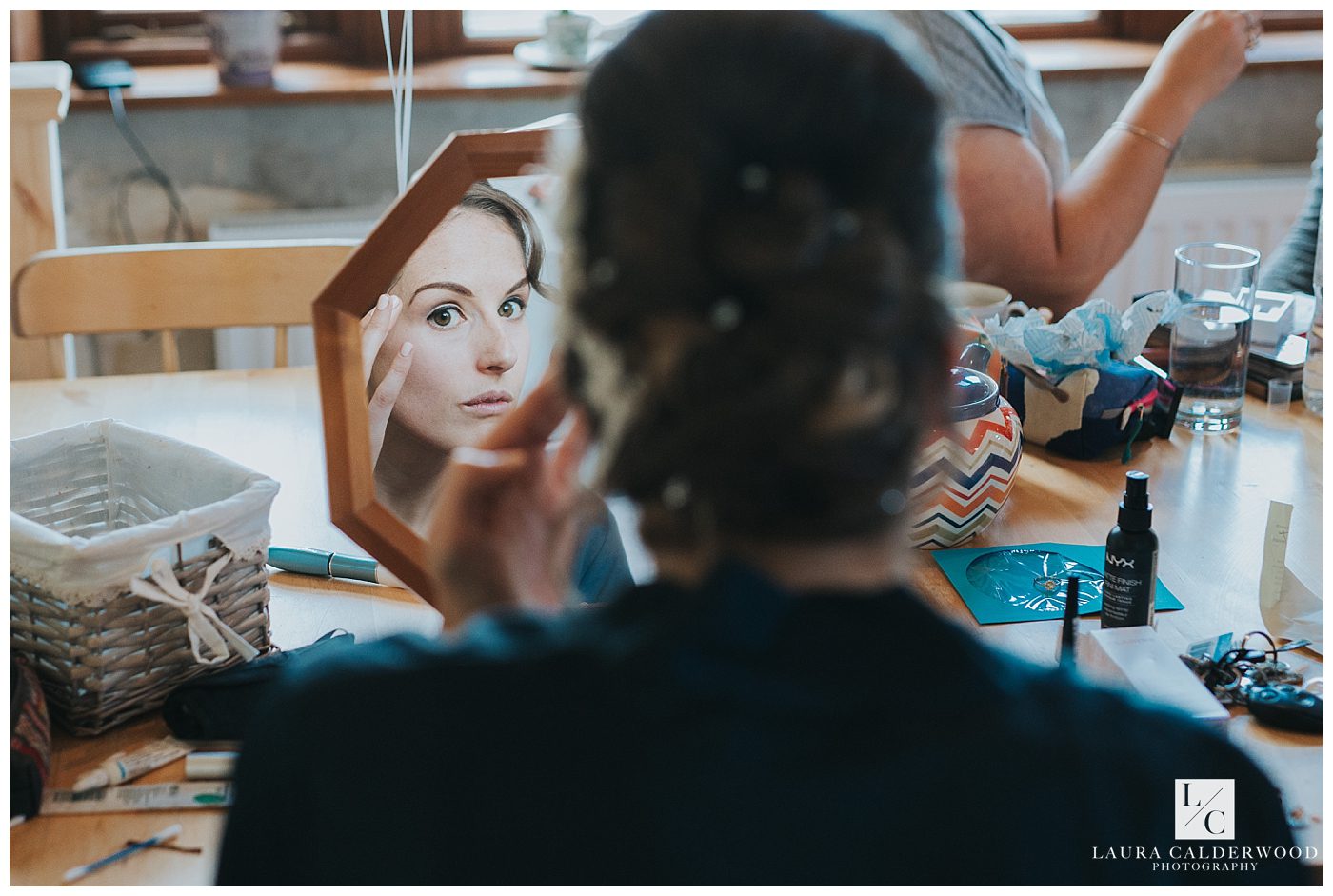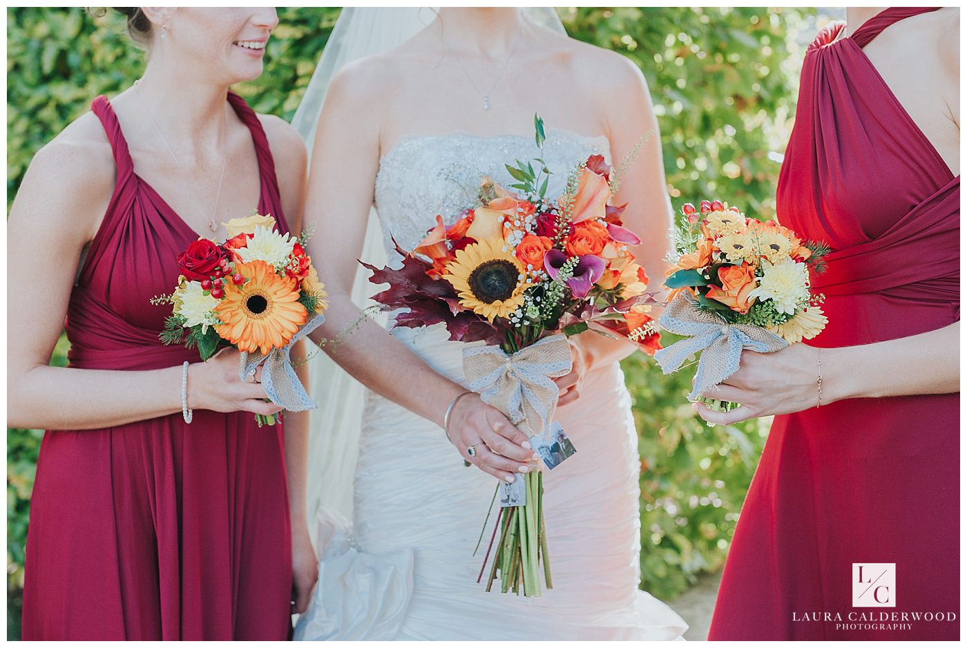 I joined Tamsin and her bridesmaids and family at her parent’s home in Ilkley and found the house full of noise and laughter – just how it should be on a wedding morning! Everyone was mid hair and make up, so I pottered from room to room capturing everything going on plus all the lovely details (including Tamsin’s stunning Ian Stuart gown, heaven!). Tamsin and her mum had made the incredible bouquets themselves and filled them with seasonal flowers and leaves in yummy autumn tones, which perfectly complimented the bridesmaids dresses which were deep red, rust and taupe.