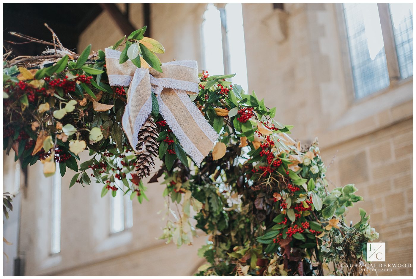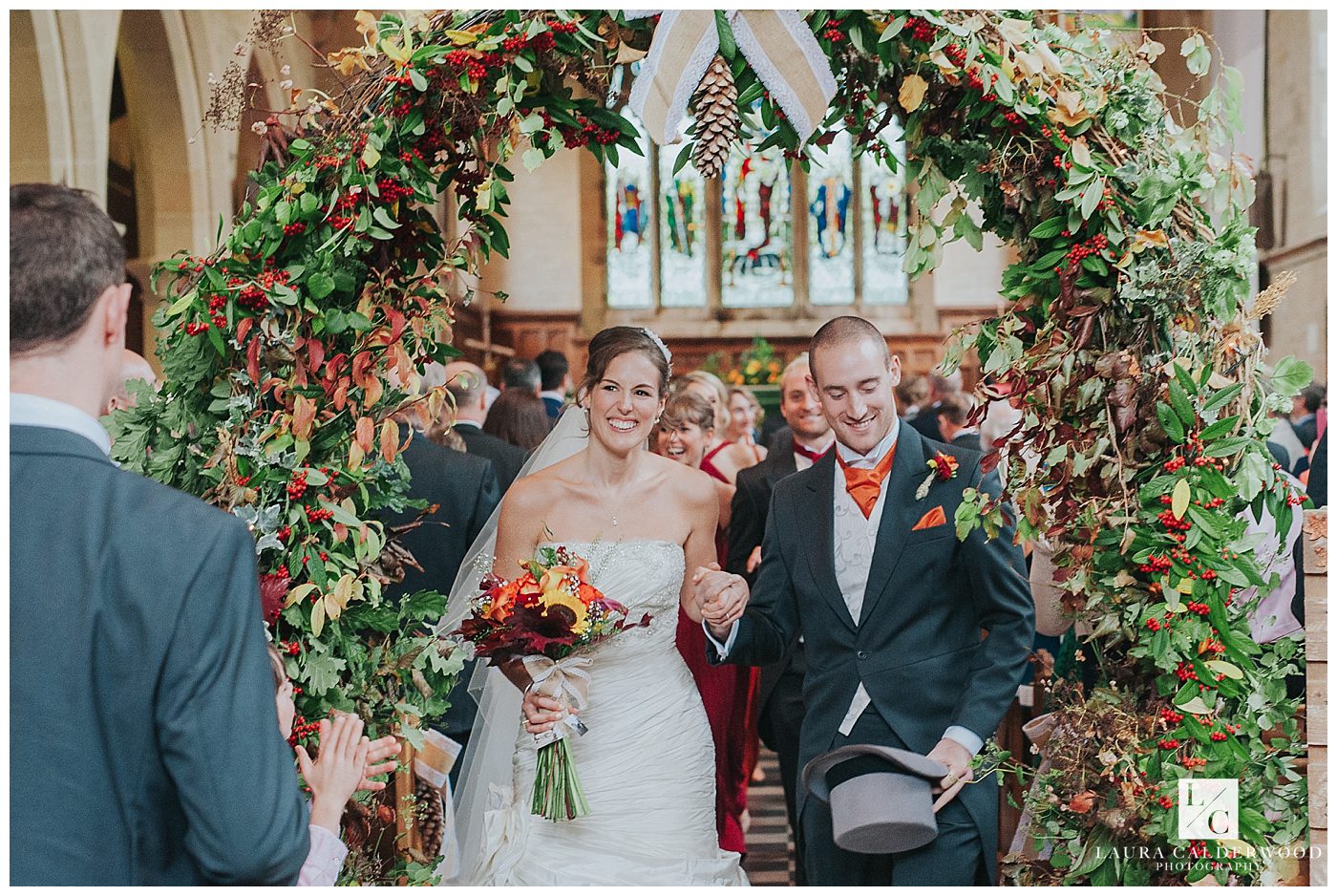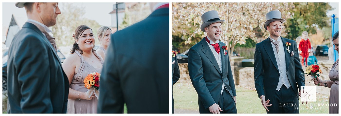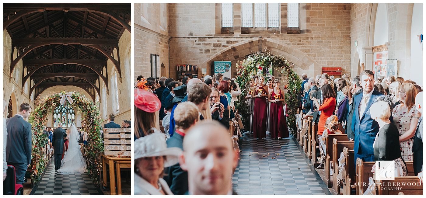 I was assisted on the day by the fab Eleanor Woodruff, and she spent the morning with the guys at Denton Hall whilst they got ready and handed out gifts (wedding socks in a perfect rust orange, made by Tamsin’s dad!). They all then headed to the church in time to see the guests arriving. Make sure you check out all the gorgeous autumn details that Tamsin and Nick had filled the church with – acorns, pine cones and leaves they had collected the previous year, and a gorgeous foliage arch at the bottom of the aisle.