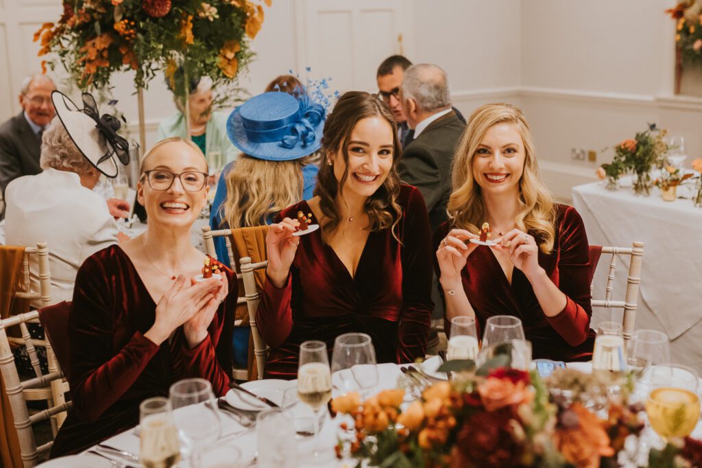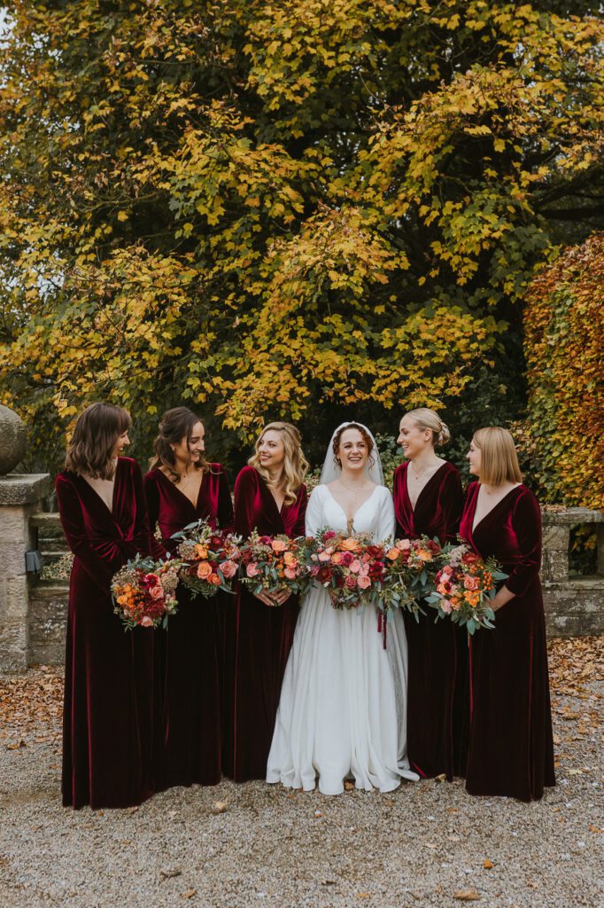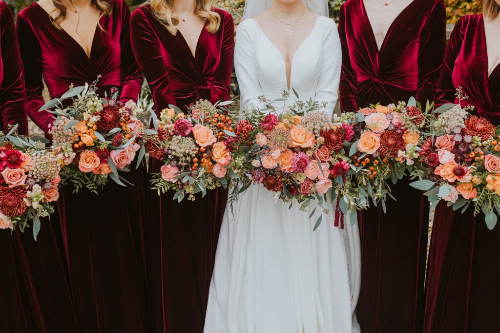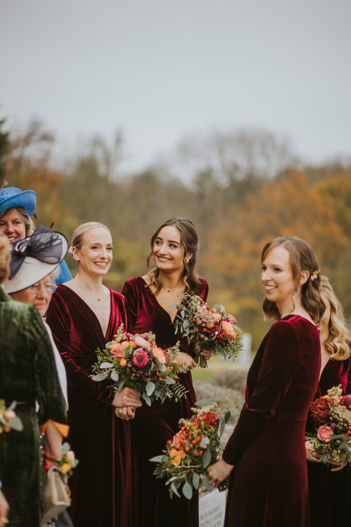 Laura wore a gorgeous long-sleeved gown by Justin Alexander, which felt absolutely made for a late-autumn wedding: timeless, romantic, and effortlessly elegant. Her bridesmaids wore velvet gowns in a deep red that added even more richness to the overall look of the day (and probably helped keep everyone a bit warmer too!).