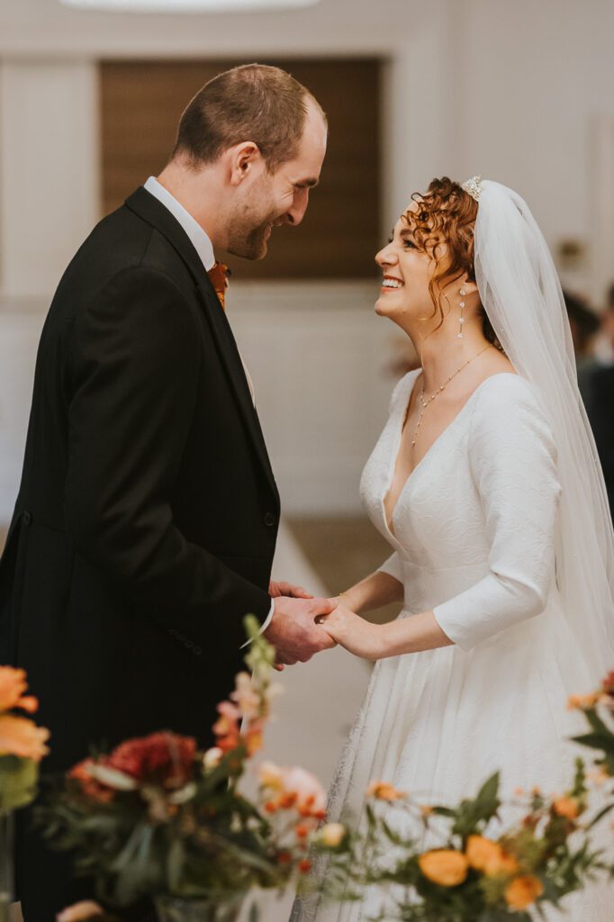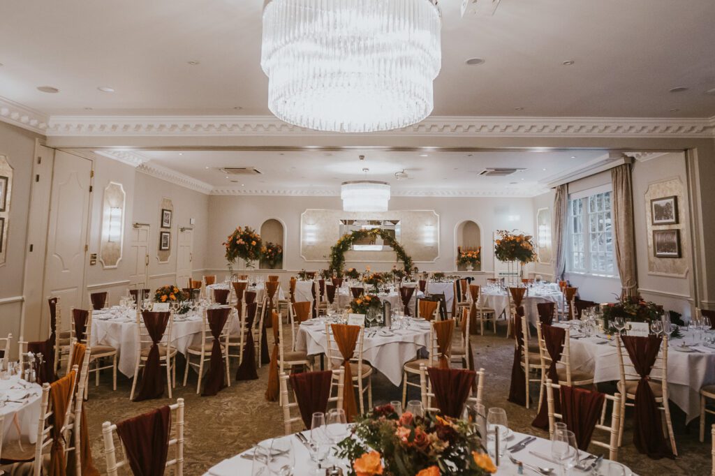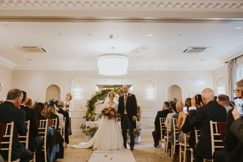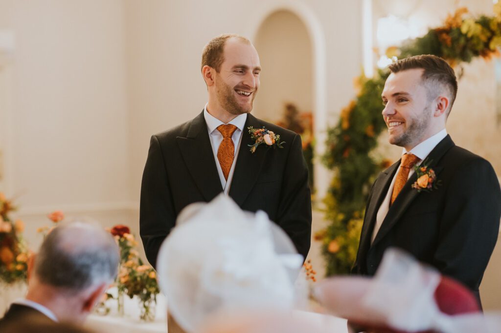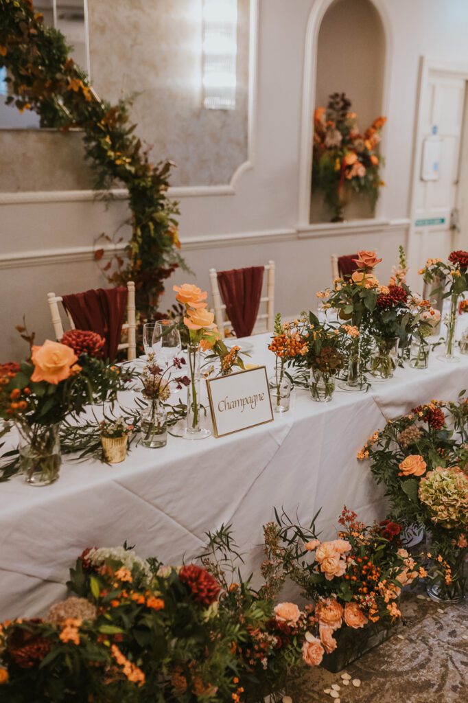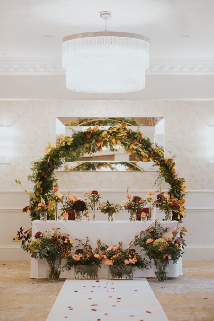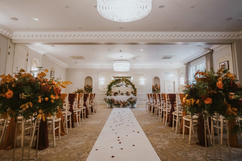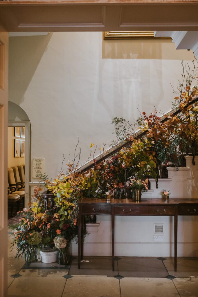 Inside, the ceremony room looked incredible thanks to the talented team at Leafy Couture. There were flowers everywhere — an elegant, glamorous seasonal display in deep autumn tones that perfectly complemented the venue’s interiors. The colours were especially stunning against Laura’s hair, which seemed to glow even more surrounded by those warm hues.