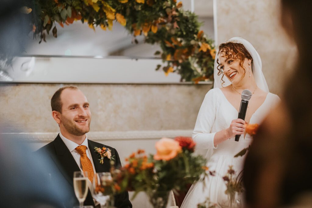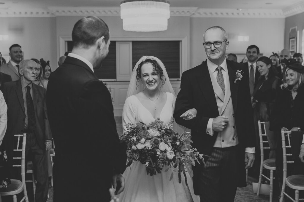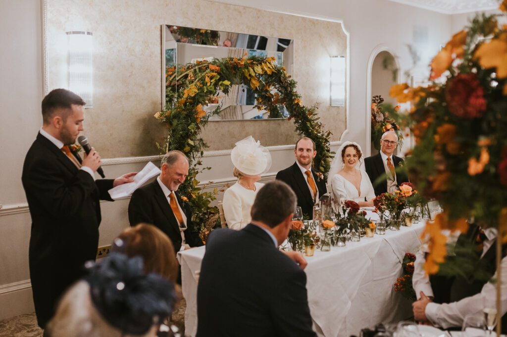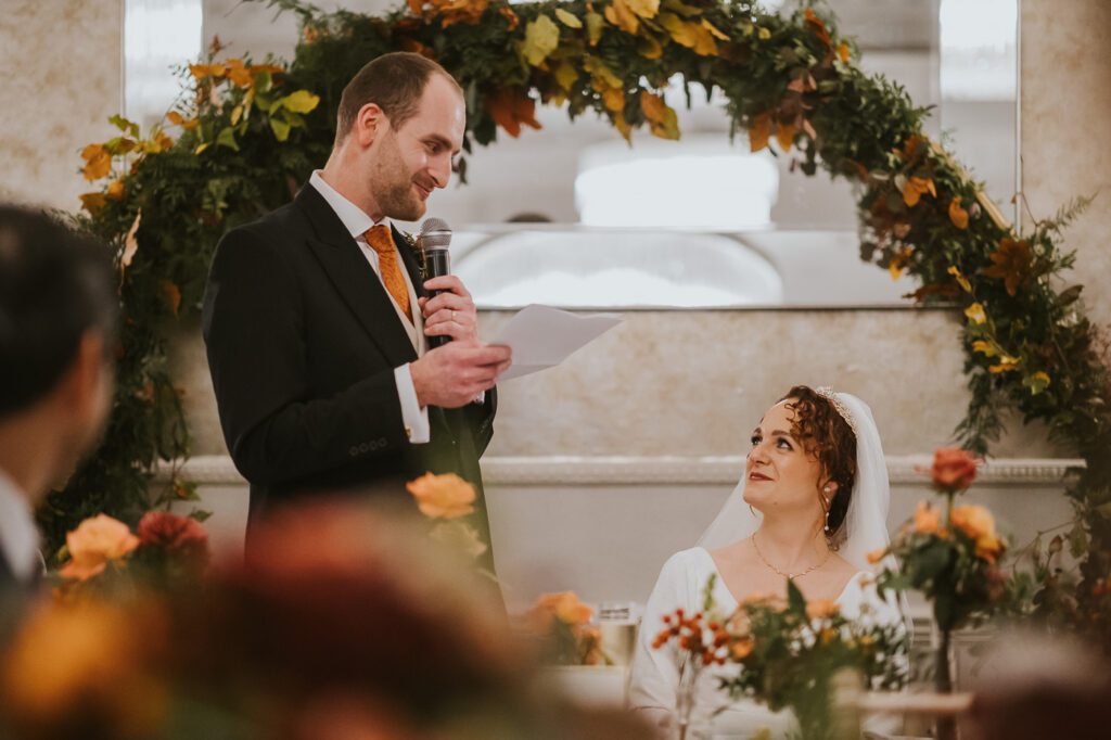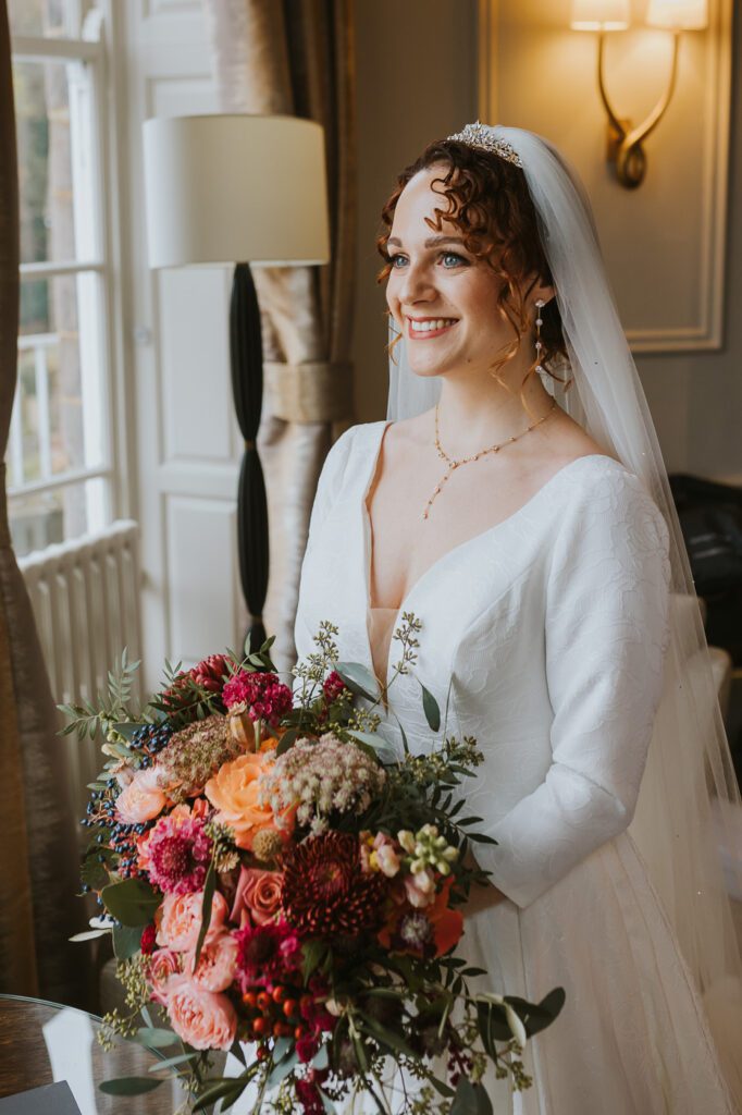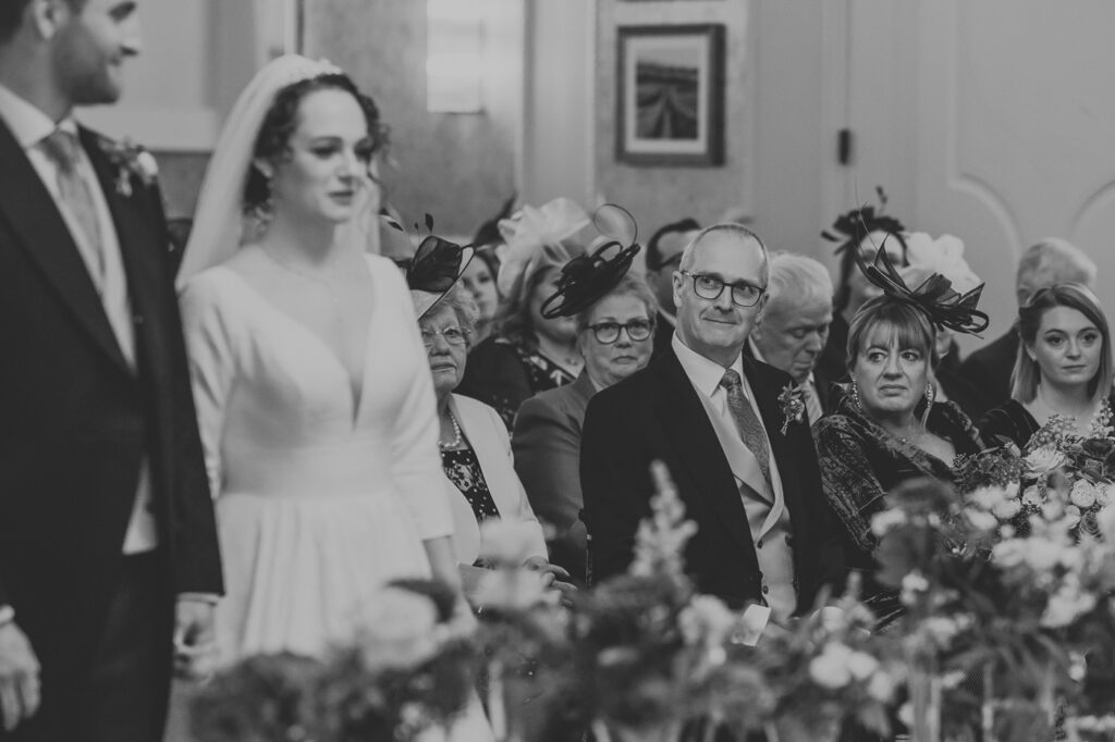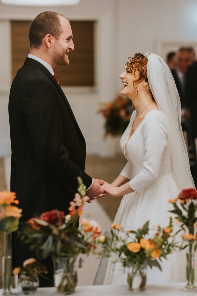 Inside, the ceremony room looked incredible thanks to the talented team at Leafy Couture. There were flowers everywhere — an elegant, glamorous seasonal display in deep autumn tones that perfectly complemented the venue’s interiors. The colours were especially stunning against Laura’s hair, which seemed to glow even more surrounded by those warm hues.