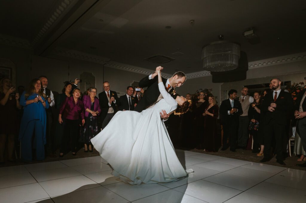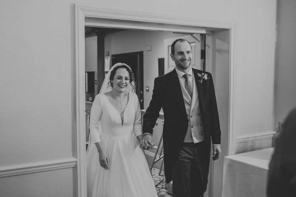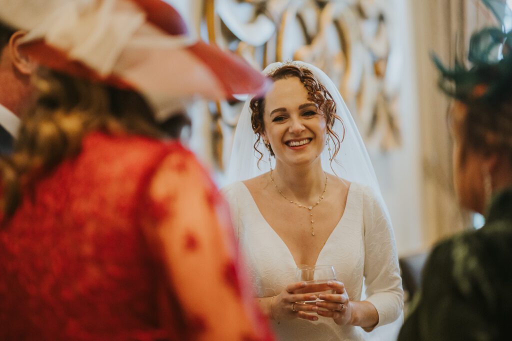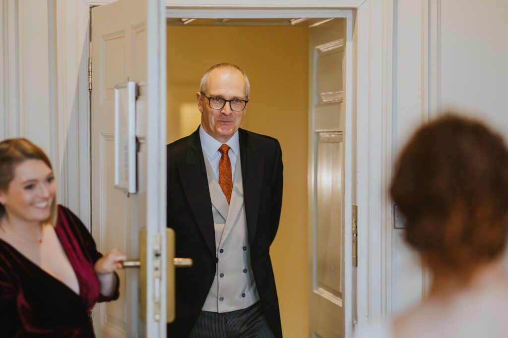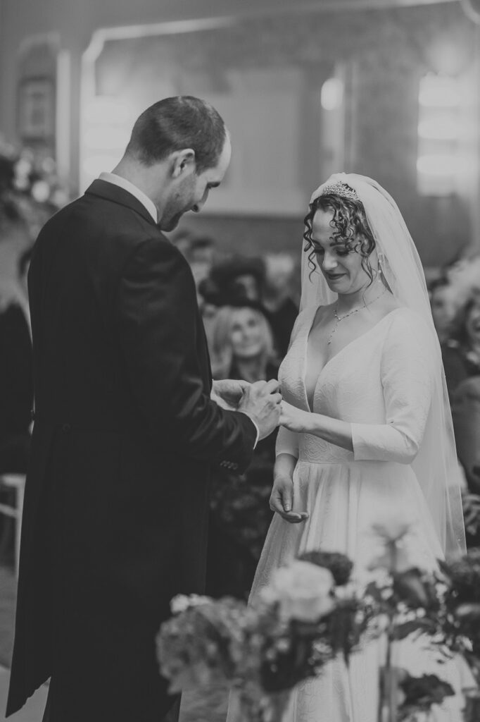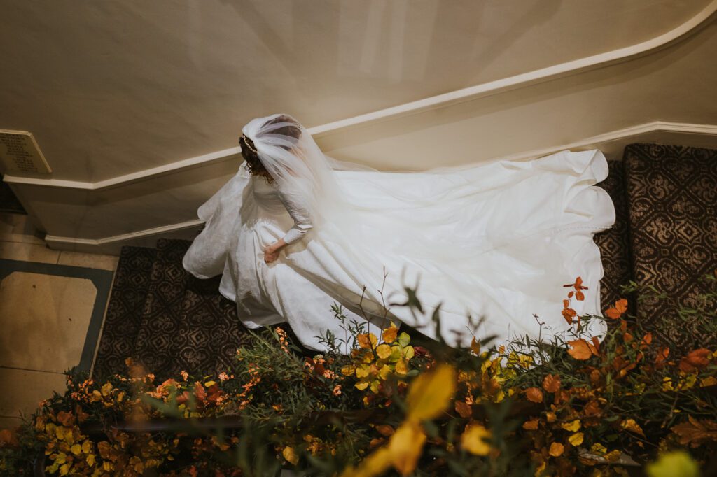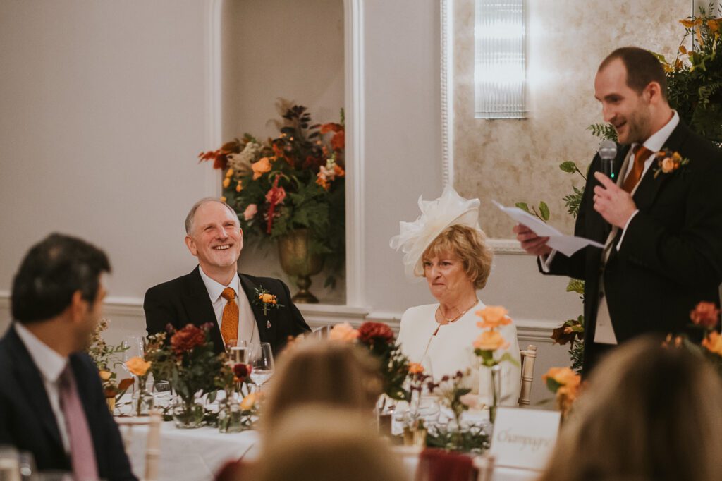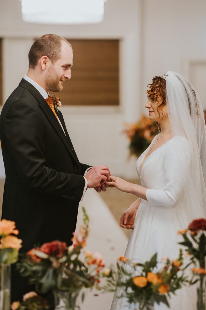 Inside, the ceremony room looked incredible thanks to the talented team at Leafy Couture. There were flowers everywhere — an elegant, glamorous seasonal display in deep autumn tones that perfectly complemented the venue’s interiors. The colours were especially stunning against Laura’s hair, which seemed to glow even more surrounded by those warm hues.